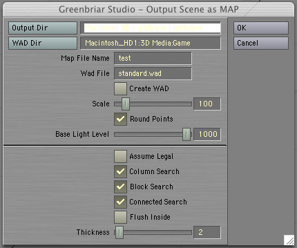 File Options - Output Dir - Where map file will be written WAD Dir - Where optional wad file will be written (so it will go directly to your wad directory) Map File Name - Name of output file - .map is added if not included with the name Create WAD - if selected a wad file of the textures applied to surfaces (not all textures in the image list) is created. Wad file - This is the wad file that is referenced in the map file. If you are creating a WAD file, this is also the name of the file to be created, .wad is added if not already part of the name. If you are not creating a wad file, this should be the name of the wad file you loaded into LW. Scale - A multiplier for converting LW's meters into quants. Scales textures and lights as well as geometry. Round Points - If selected all geometry references (including light locations) are rounded to the closest quant, to avoid the rounding errors that appear as gaps between blocks. Base Light Level