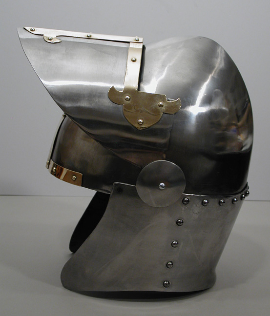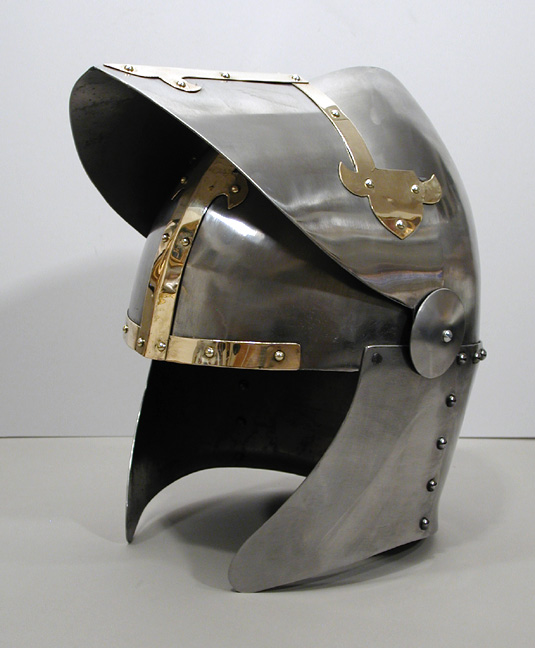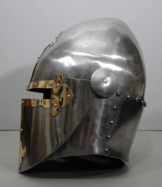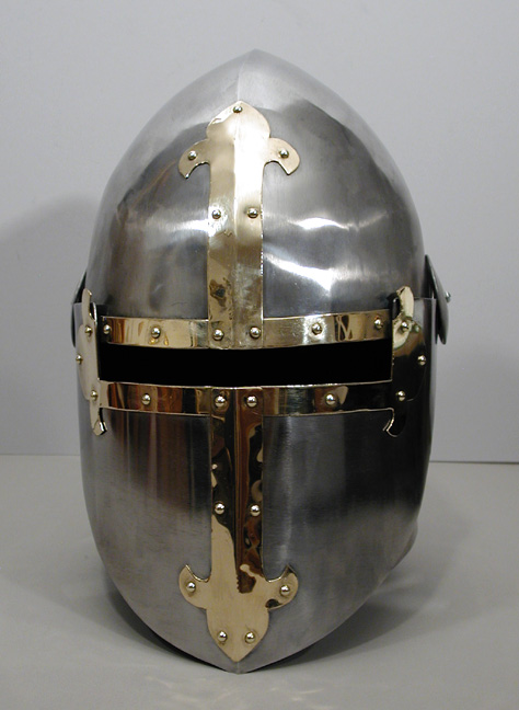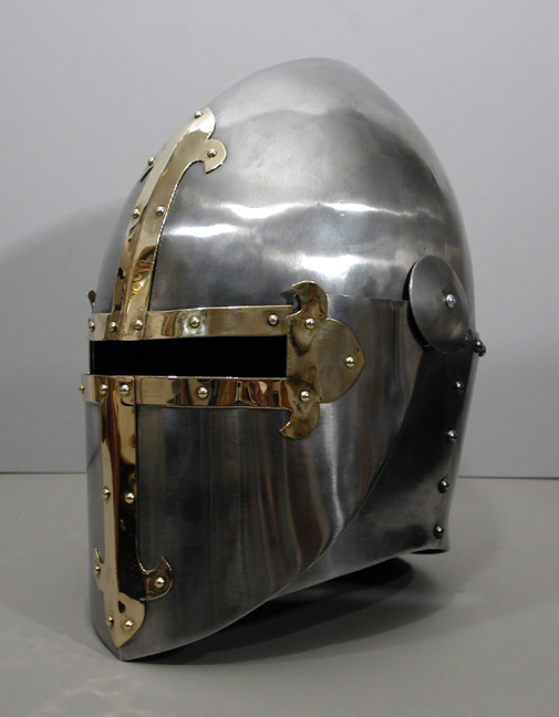 Visored Italian Great Helm 1325 - 14 g Mild, Level II finish, Brass cross version shown